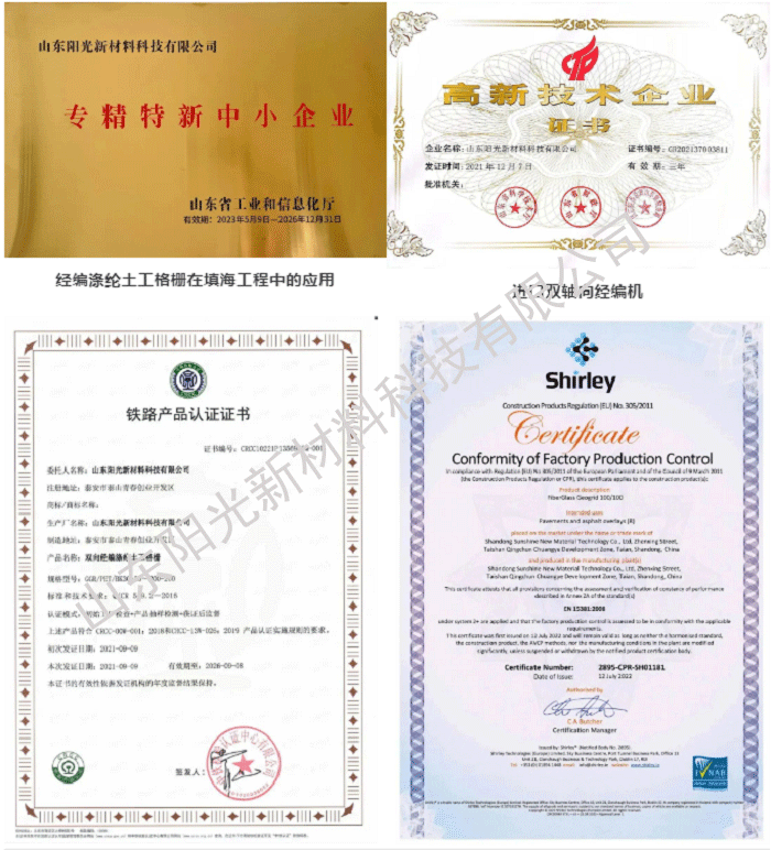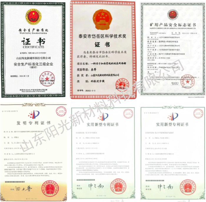公司是山東省“專精特新”中小企業(yè)、山東省高新技術(shù)企業(yè)、科技型中小企業(yè)、安全生產(chǎn)標(biāo)準(zhǔn)化三級企業(yè),《一種加熱管線的硅晶網(wǎng)格柵》項目獲泰安市岱岳區(qū)科學(xué)進(jìn)步獎,煤礦井下用聚酯纖維增強塑料網(wǎng)假頂獲礦用產(chǎn)品安全標(biāo)志證書,擁有多項發(fā)明和實用新型專利。公司產(chǎn)品通過了ISO 9001質(zhì)量管理體系認(rèn)證、ISO 14001環(huán)境管理體系認(rèn)證、ISO 45001職業(yè)健康安全管理體系認(rèn)證、歐盟cpr認(rèn)證及CRCC鐵路體系認(rèn)證。