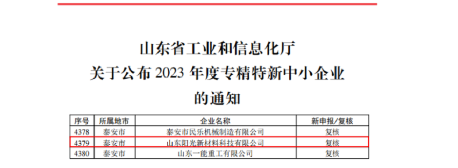 近日,山東省工業(yè)和信息化廳發(fā)布《關(guān)于公布2023年度專精特新中小企業(yè)的通知》(魯工信創(chuàng)〔2023〕78號),中國土工合成材料工程協(xié)會會員單位山東陽光新材料科技有限公司通過復(fù)核。